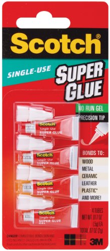 Scotch Single Use Super Glue Gel is a fast-bonding super glue gel that bonds to a variety of surfaces. Product contains 4 0.017oz (0.5g) tubes (for a total of 0.07oz (2g) of super glue gel that contains enough adhesives for a single bonding job.