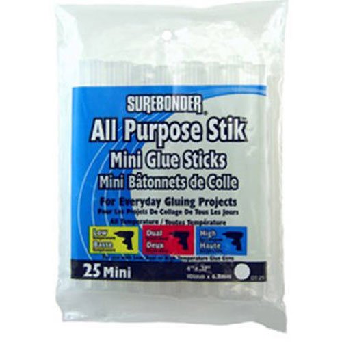 Surebonder DT-25 All Temperature Mini Glue Sticks is an all-temperature hot melt adhesive that works at either low temperature (230 degrees F) or high temperature (380 degrees F) for everyday gluing projects. Use with high or low temperature glue guns. Bonds to metal, wood, paper, fabric, magnets, ceramics, floral arrangements, glass and plastic using a high temperature glue gun. Bonds to delicate materials such as balloons, ribbon, lace and children's crafts using a low temperature glue gun. Clear color with 60-65 second working time. 5/16 -Inch diameter by 4-Inch length. 25 sticks per bag.